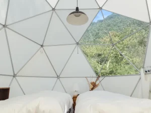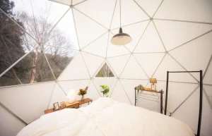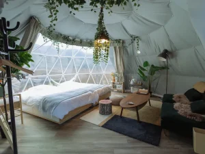水沼ヴィレッジの大型ドームテントは、広々とした室内と上質なインテリアで、まるで森の中のリビング。