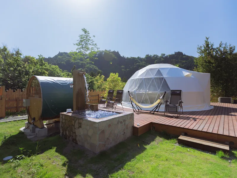 カップルやご夫婦での特別なひとときにふさわしい、贅沢なグランピング体験をお届けします。お部屋にはサウナと水風呂も付いているので大自然の中でアウトドアサウナを楽しめます。